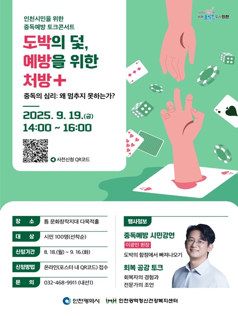 [무한뉴스=정승훈 기자] 인천광역시는 4대 중독 중 하나인 도박중독 예방을 위해 전문가 강연과 회복 공감 토크가 어우러진 ‘2025년 2차 중독예방 시민강연’을 개최한다고 밝혔다.
