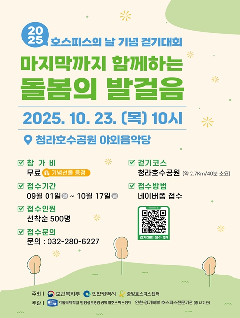 [무한뉴스=정승훈 기자] 인천광역시는 호스피스·완화의료에 대한 시민들의 이해를 높이고 생명존중 문화를 확산하기 위해 오는 10월 23일 오전 10시, 청라호수공원에서 ‘2025년 호스피스의 날 기념 걷기대회’를 개최한다고 밝혔다.