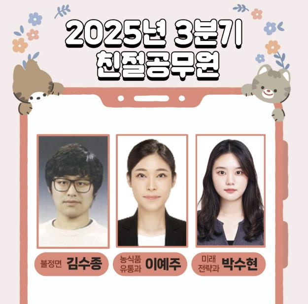 [무한뉴스=정민정 기자] 충북 괴산군은 2025년 3분기 친절공무원으로 김수종 주무관(불정면사무소), 이예주 주무관(농식품유통과), 박수현 주무관(미래전략과)을 선정했다고 밝혔다.