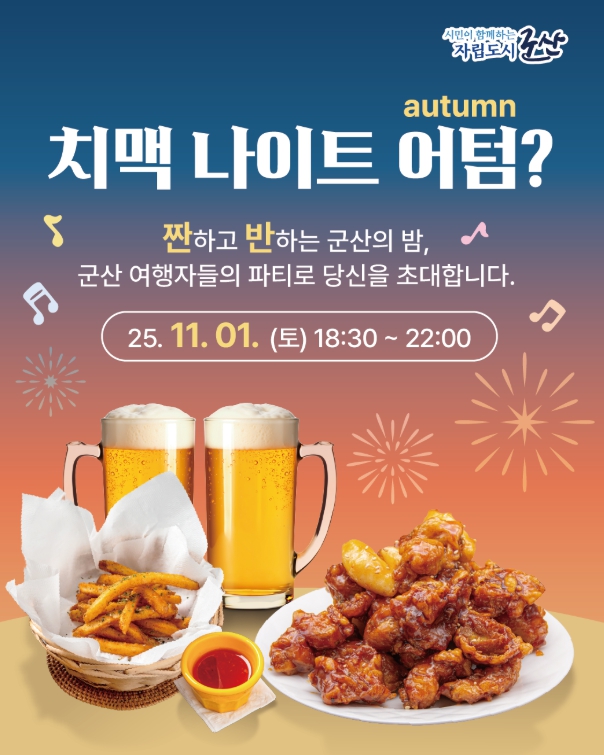 [무한뉴스=정민정 기자] 깊어가는 가을밤, 군산시가 탁 트인 야외에서 즐기는 특별한 행사 ‘치맥나이트 어텀(Autumn)?’을 11월 1일 저녁 군산 내항 일원에서 개최한다.