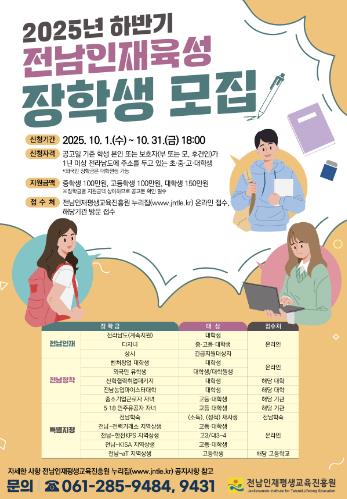 [무한뉴스=정민정 기자] 전라남도와 전남인재평생교육진흥원은 실질적인 교육기회 보장과 미래인재로의 성장, 지역 정착을 지원하기 위한 2025년 하반기 전남인재육성 장학생을 오는 31일까지 모집한다.