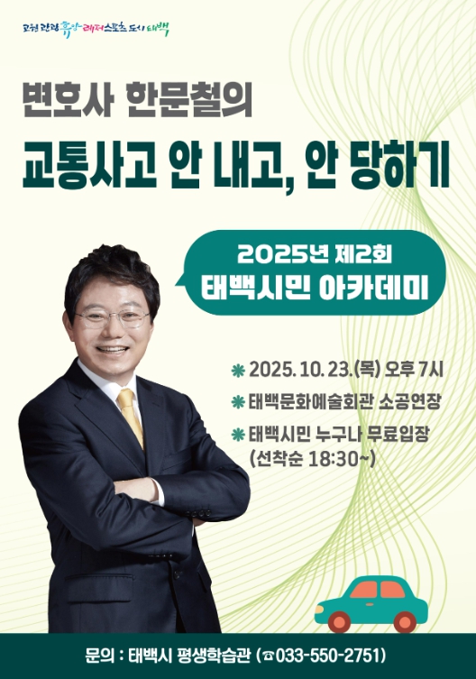 [무한뉴스=정민정 기자] 태백시는 시민들의 교통안전 의식을 높이고 사고 예방 문화를 확산하기 위해 오는 23일 오후 7시, 태백문화예술회관 소공연장에서 ‘제2회 태백시민 아카데미’를 개최한다고 밝혔다.