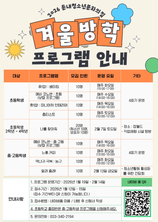 [무한뉴스=정민정 기자] 둔내청소년문화의집이 다가오는 겨울방학을 맞아 지역 청소년들의 소질 계발과 유익한 여가 선용을 위한 ‘2026년 겨울방학 프로그램’ 수강생을 모집한다.
