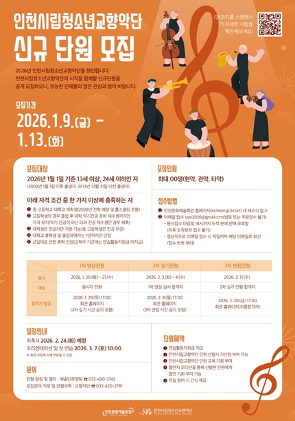 [무한뉴스=정승훈 기자] 인천광역시 문화예술회관이 2026년 창단 예정인 인천시립청소년교향악단에서 활동할 신규 단원을 공개 모집한다.