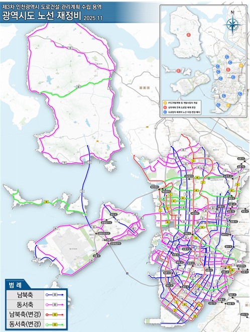[무한뉴스=정승훈 기자] 인천광역시는 12월 22일 송도·청라경제자유구역 및 계양 테크노밸리(TV) 개발계획, 고속도로 건설 및 교통혼잡도로 개선사업계획 등 국가 상위계획을 반영해 광역시도 노선 체계를 재정비하여 고시한다고 밝혔다.
