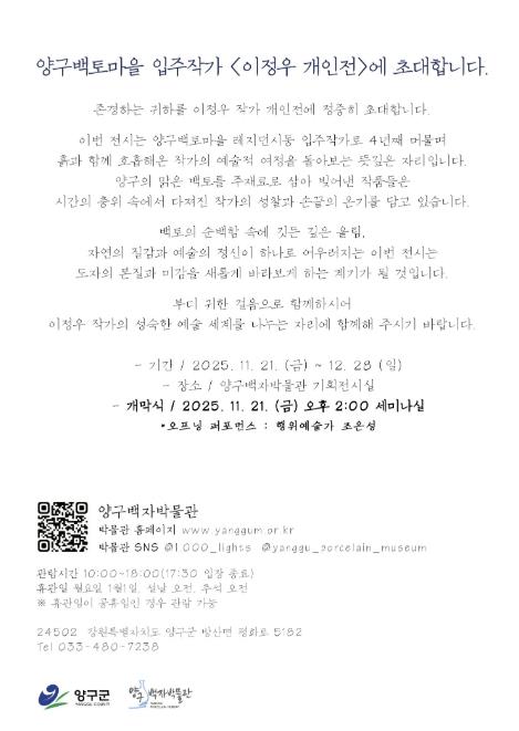 [무한뉴스=정민정 기자] 양구군은 이달 21일부터 12월 28일까지 양구백자박물관 세미나실에서 양구백토마을 입주작가 이정우의 개인전 ‘같음의 차이, 다름의 질서 – White, Wave, Trace’을 개최한다.