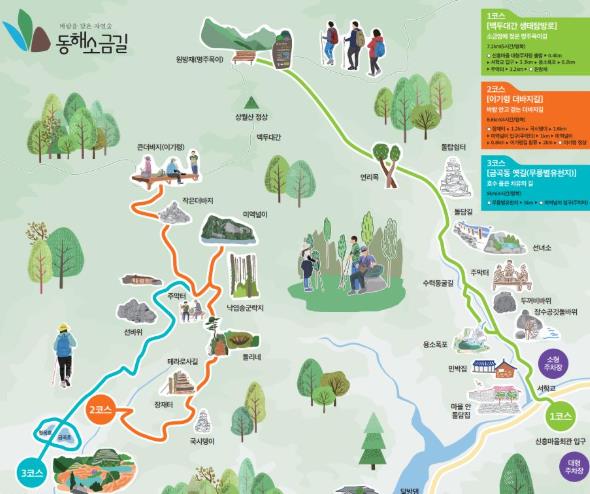 ▲제1코스 ‘소금땀에 젖은 명주목이길’(7.1km·5시간)은 신흥마을 생태놀이터–서학골–용소폭포–주막터–이끼쉼터–원방재로 이어지는 역사·생태 탐방로다.