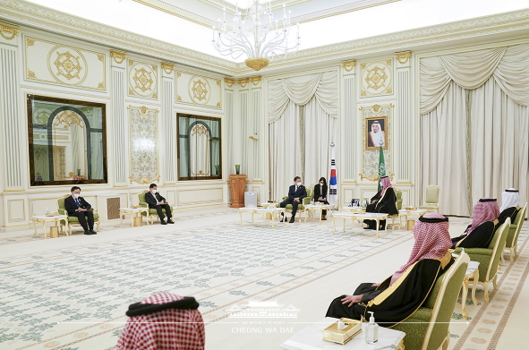 아울러 문 대통령은 사우디는 한반도 평화를 위한 우리의 노력을 일관되게 지지해 준 굳건한 우방국으로, 한반도 평화 프로세스가 실질적 진전을 이룰 수 있도록 변함없는 협조와 지지를 당부했다.