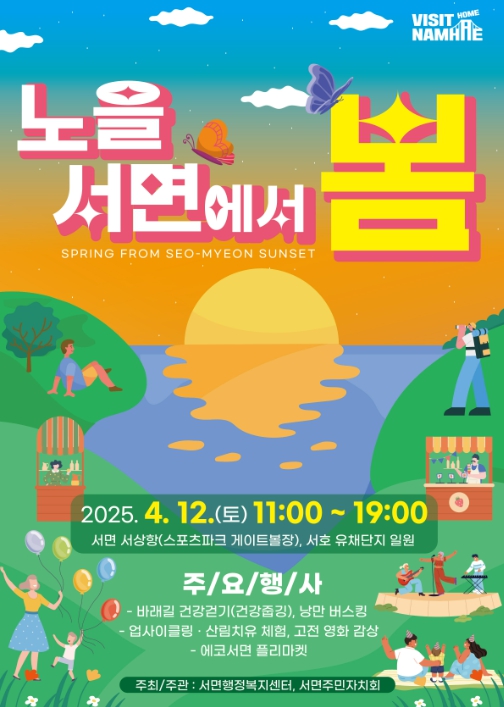 [무한뉴스=최진수 기자] 서면주민자치회(회장 박영철)와 서면행정복지센터에서 주관하는‘노을 서면에서 봄’ 행사가 오는 4월 12일 서면 서상항(서상게이트볼장)과 서호 유채단지 일원에서 열린다.