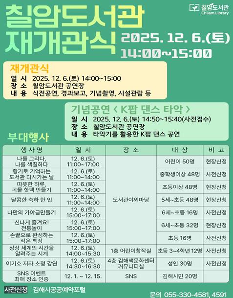 재개관식은 김해시립가야금연주단의 식전공연을 시작으로 경과보고, 공로자 감사패 수여, 인사말씀과 축사 후 새 단장한 도서관으로 자리를 옮겨 시설 관람으로 마무리 된다.