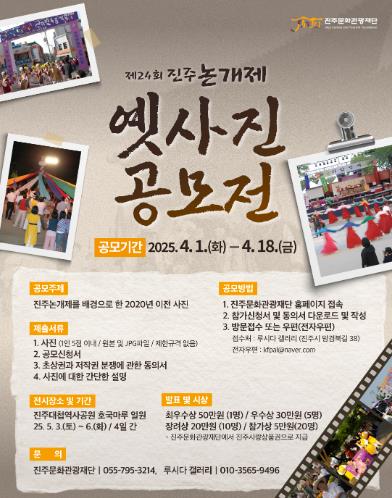 본사진 또는 스캔본 사진을 1인당 5점 이내로 응모 가능하며, 진주문화관광재단 누리집에서 참가신청서, 동의서 서식을 내려받아 작성 후 출품작과 함께 주관사인 루시다갤러리로 방문 또는 전자우편으로 접수할 수 있으며, 기타 자세한 사항은 재단으로 문의하면 된다.