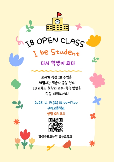 또, 오는 19일 구미고등학교에서 ‘IB OPEN CLASS – I be Student: 다시! 학생이 되다’ 연수가 개최된다. 이 연수는 교원들이 직접 IB 수업을 체험하는 참여형 프로그램으로, 초․중․고 교원이 IB 수업을 직접 듣고, 그 철학과 교수․학습 방식을 몸소 체득하는 기회를 제공한다.