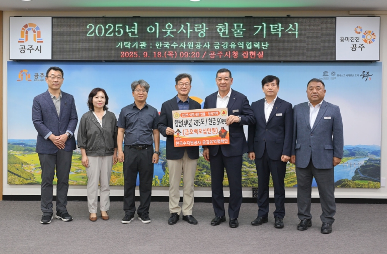 한국수자원공사 금강유역협력단(단장 신성희)은 지난 18일 시청 집현실에서 백미 295포(4kg, 500만 원 상당)와 성금 50만 원 등 총 550만 원 상당의 성금과 물품을 기탁했다.