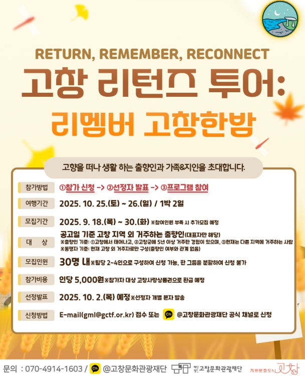 조창환 고창문화관광재단 상임이사는 “이번 ‘고창 리턴즈 투어: 리멤버 고창한밤’은 출향인과 가족이 함께 고향의 매력을 다시 체험하며 정서적 유대를 이어가는 소중한 기회가 될 것”이라며, “많은 출향인 분들이 함께해 고창의 가을을 즐기고 따뜻한 추억을 남기길 바란다”고 전했다.