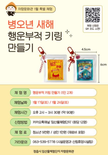 [무한뉴스=정민정 기자] 정읍시 임산물체험단지 내 차향문화관이 2026년 새해를 맞아 오는 17일과 24일, 온 가족이 함께 참여해 새해 소망을 비는 ‘행운 부적 키링 만들기’ 프로그램을 운영한다고 13일 밝혔다.