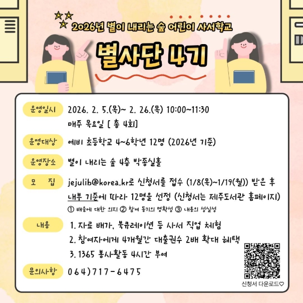 [무한뉴스=정민정 기자] 제주도교육청 제주도서관은 어린이들이 사서 직업을 직접 체험하며 도서관의 역할과 가치를 이해할 수 있도록 2026년 별이 내리는 숲 어린이 사서 학교 ‘별사단 4기’를 운영한다.