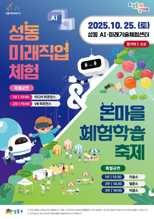 [무한뉴스=정승훈 기자] 서울 성동구가 오는 10월 25일 성동 AI‧미래기술체험센터 일대에서 '성동 미래직업체험 · 온마을체험학습 축제'를 개최한다고 밝혔다.