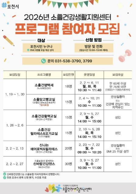 | ▲ 포천시 소흘건강생활지원센터, 2026년 상반기 건강 증진 프로그램 참여자 모집 |