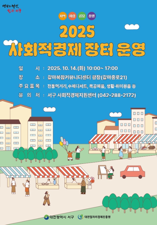 [무한뉴스=정민정 기자] 대전 서구는 이달 14일 오전 10시부터 오후 5시까지 갈마복합커뮤니티센터 광장에서 지역·사람·공유·상생을 주제로 한 ‘2025 사회적경제장터’를 운영한다.