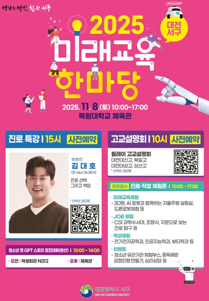 [무한뉴스=정민정 기자] 대전 서는 11월 8일 목원대학교 체육관에서 초중고 학생·청소년과 학부모를 대상으로 ‘서구 미래교육한마당’ 행사를 개최한다.