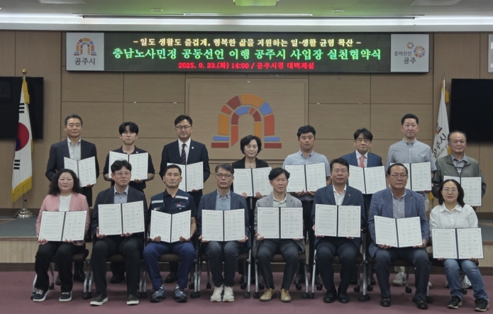 [무한뉴스=정민정 기자] 공주시는 지난 23일 시청 대백제실에서 충남 노사민정 공동선언의 구체적 이행을 위한 실천 협약을 체결하고, 일·생활 균형 확산에 힘을 모으기로 했다고 밝혔다.