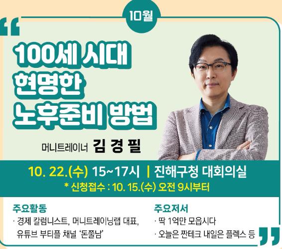 한편, 창원아카데미 10월 강연 사전신청은 10월 15일 오전 9시부터 창원시 홈페이지(시민참여-모집신청접수)에서 재테크에 관심있는 시민 누구나 무료로 신청 가능하다.