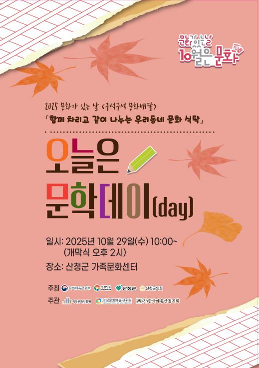 [무한뉴스=최진수 기자] 산청군은 오는 29일 가족문화센터에서 ‘오늘은 문학데이(day)’를 운영한다고 24일 밝혔다.