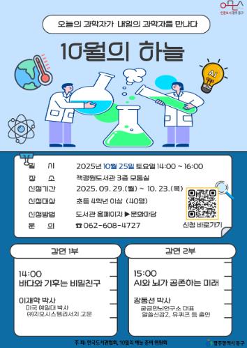 [무한뉴스=정민정 기자] 광주 동구는 25일 오후 2시 구립도서관 책정원 3층 모둠실에서 미래 과학자를 꿈꾸는 청소년들을 위한 특별 과학 강연 행사인 ‘10월의 하늘’을 개최한다고 밝혔다.