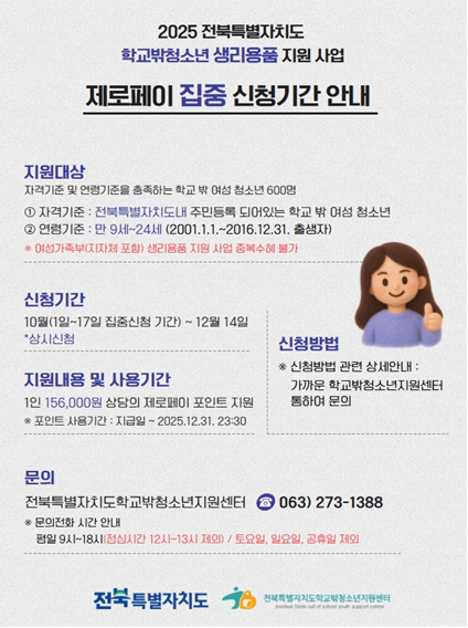 [무한뉴스=정민정 기자] 전북특별자치도가 경제적 부담을 겪는 학교 밖 여성청소년들을 대상으로 생리용품을 지원하는‘2025년 학교 밖 여성청소년 건강지원사업’을 추진한다.
