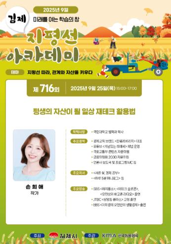 [무한뉴스=정민정 기자] 김제시는 오는 25일 제716회 지평선아카데미에 금융 크리에이터로 활동 중인 손희애 작가를 초청해 “평생의 자산이 될 일상 재테크 활용법”이라는 주제로 강연을 진행한다고 밝혔다.