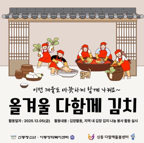 이번 활동은 2025년 12월 5일 신동 다함께돌봄센터·신동청소년아동장학복지센터 공동으로 주관하여 진행되며, 김장 전달식은 2025년 12월 9일 9가구에 전달될 예정이다.