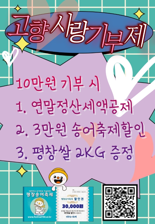 전재준 군 세정과장은 “평창송어축제를 찾는 방문객들이 고향사랑기부에 참여하고 1석 3조의 혜택을 챙겨가셨으면 좋겠다.”라고 밝혔다.