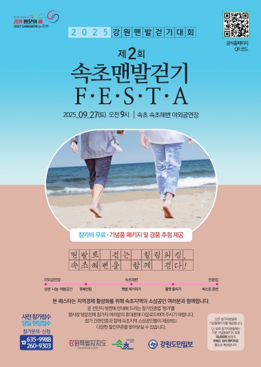 [무한뉴스=정민정 기자] 속초시는 강원특별자치도 및 강원도민일보와 함께 오는 9월 27일 속초해수욕장에서 외옹치해수욕장 구간을 따라 ‘제2회 2025 속초시 강원 맨발걷기 대회’를 연다. 지난해에 이어 두 번째로 마련되는 이번 대회는 자연 속에서 맨발로 걸으며 건강과 힐링을 동시에 경험할 수 있는 특별한 축제다.