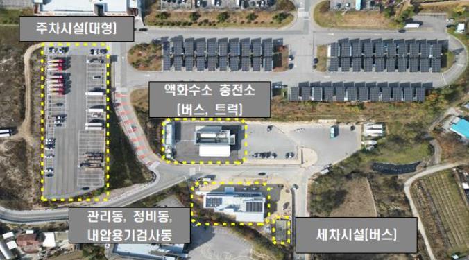 ‘수소교통복합기지’는 하루 최대 100대의 수소 버스·트럭 충전이 가능한 2,000㎏ 규모의 액화수소 충전소 4대를 중심으로 △정비시설 △세차시설 △내압용기 검사소 △화물차 주차장 확장 △복합관리동 등 수소차 운행에 필요한 기능을 한 곳에 모아 구축한 시설이다.
