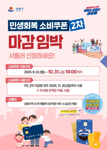 [무한뉴스=정민정 기자] 강릉시가 민생회복 소비쿠폰 2차 신청 마감일인 10월 31일을 앞두고, 아직 신청하지 않은 시민들을 대상으로 신청 독려에 나선다.