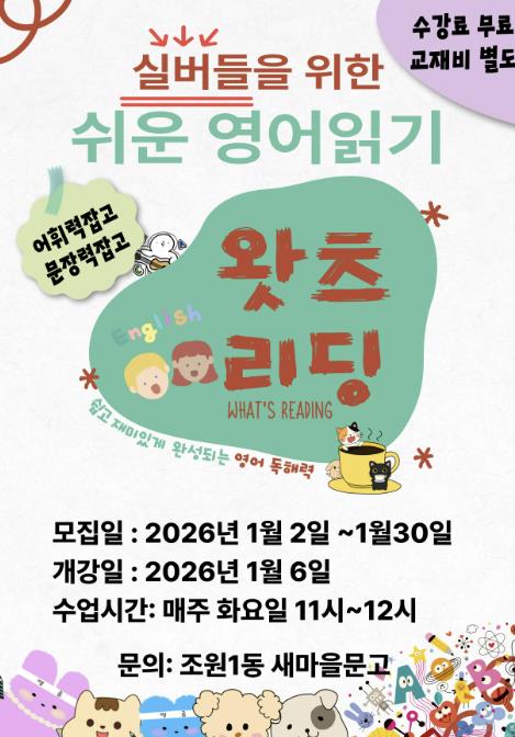 [무한뉴스=양현명 기자] 수원시 장안구 조원1동 새마을문고는 1월 6일부터 27일까지 실버들을 위한 쉬운 영어읽기 ‘왓츠리딩’ 프로그램을 추진한다