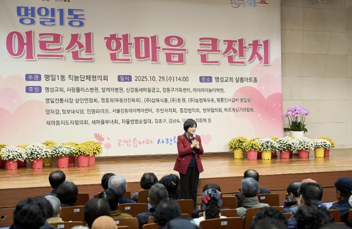 [무한뉴스=박노신 기자] 서울 강동구 명일1동은 지난 10월 29일 명성교회 샬롬아트홀에서 관내 어르신 250여 명을 모시고, ‘명일1동 어르신 한마음 큰잔치’를 성황리에 개최했다고 밝혔다.