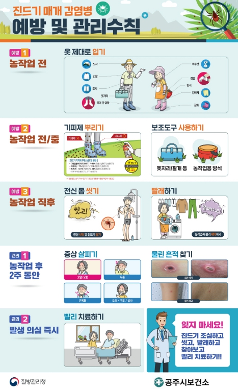 이를 예방하기 위해서는 ▲밝은색 긴팔과 긴바지를 착용해 피부 노출 최소화하기 ▲진드기 기피제 사용하기 ▲풀밭에서 용변 보지 않기 ▲귀가 후 바로 샤워하며 물린 흔적 확인하기 ▲작업복과 일상복을 구분해 세탁하기 등 생활 수칙을 철저히 지켜야 한다.