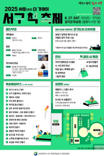 [무한뉴스=정민정 기자] 대전 서구는 이달 27일 월평도서관 옆 갈마문화공원에서 ‘2025 서구 책 축제(부제: 서로(書路) 더 가까이)’를 개최한다.