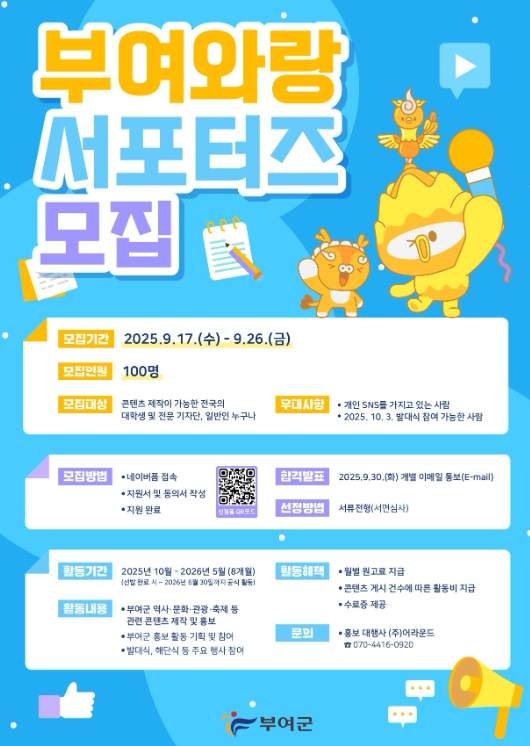 서포터즈로 선발되면 2025년 10월부터 2026년 5월까지 8개월간 활동하며, 부여의 역사·문화·축제 등 다양한 주제를 담은 콘텐츠 제작과 홍보 활동을 맡는다.