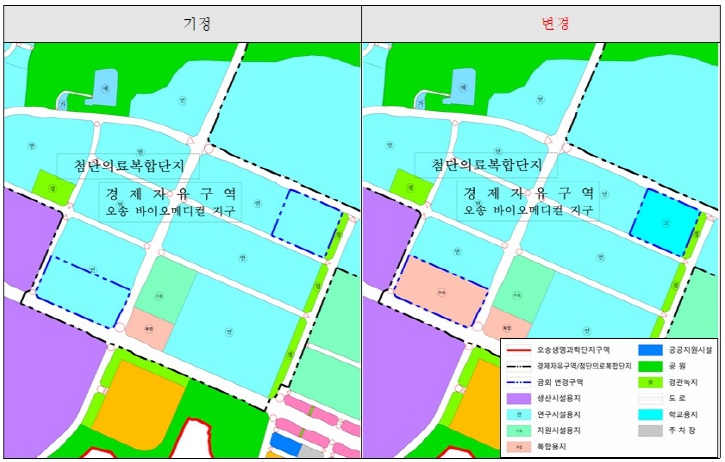 [무한뉴스=정민정 기자] 충북도는 11월 17일 오송첨단의료복합단지의 토지이용계획을 변경하는 개발실시계획이 승인됐다고 밝혔다. 이를 통해 오송읍 연제리 682-2, 682-3은 연구시설용지에서 복합용지로, 연제리 657은 연구시설용지에서 학교시설용지로 변경된다.