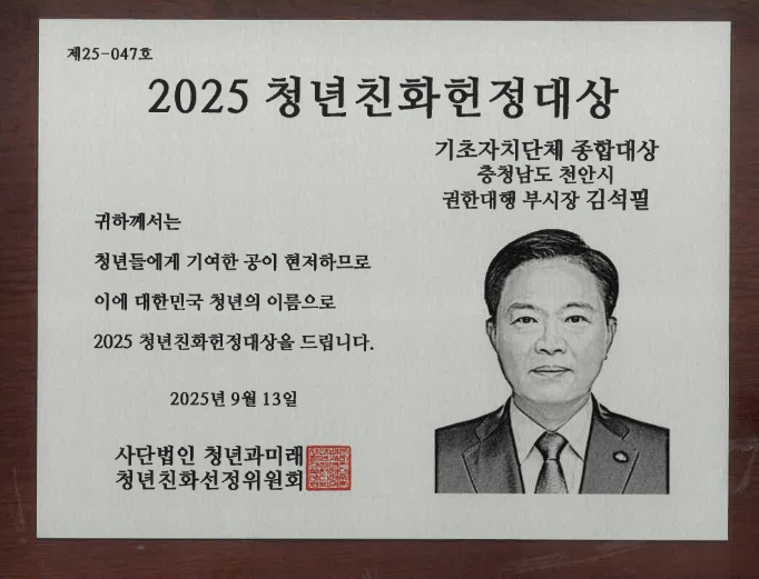 김석필 천안시장 권한대행은 “천안시의 청년정책이 2년 연속 종합대상을 수상하게 된 것은 행정의 노력만이 아니라, 청년들과 함께 고민하고 소통하며 만들어온 성과”라며 “앞으로도 청년의 목소리에 귀 기울이며, 청년과 함께 미래를 열어가는 도시를 만들어 가겠다”고 밝혔다.