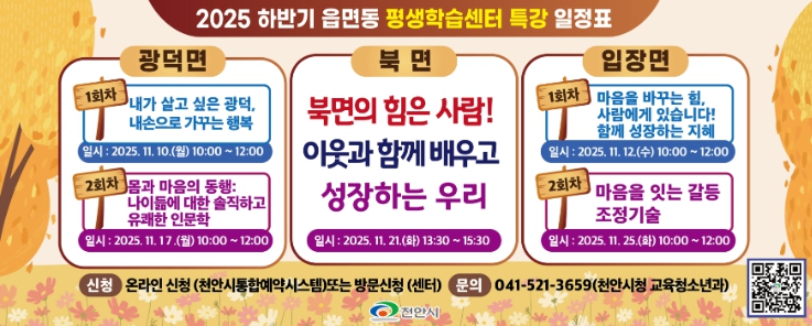 [무한뉴스=정민정 기자] 천안시는 이달 10일부터 다음 달 25일까지 ‘2025년 하반기 읍면동평생학습센터 인문학 특강’을 운영한다고 3일 밝혔다.