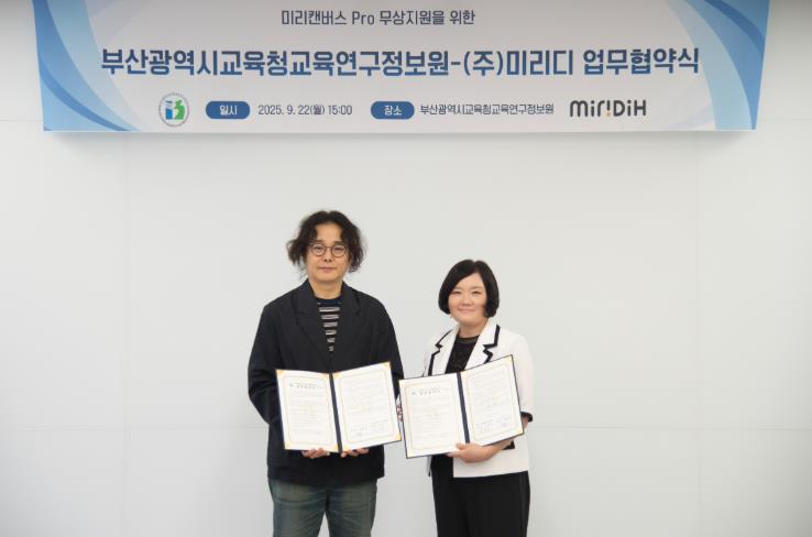 [무한뉴스=최진수 기자] 부산광역시교육청교육연구정보원은 지난 22일 오후 교육연구정보원 회의실에서 (주)미리디(대표 강창석)와 업무협약을 체결했다고 밝혔다.