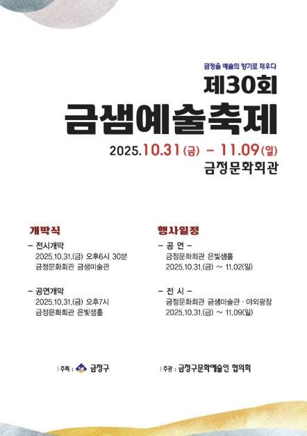 [무한뉴스=최진수 기자] 부산시 금정구가 주최하고 금정구 문화예술인협의회(회장 도태근)가 주관하는 10월 31일부터 11월 9일까지 금정문화회관 은빛샘홀, 금샘미술관 전시실, 야외광장에서 ‘제30회 금샘예술축제’를 개최한다.