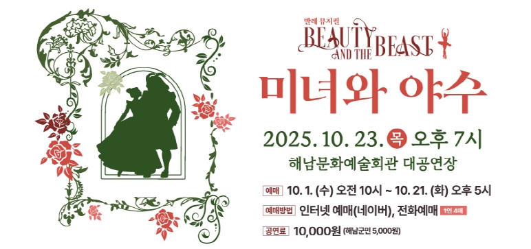 [무한뉴스=정민정 기자] 해남군은 오는 10월 23일 오후 7시 해남문화예술회관 대공연장에서 발레뮤지컬 ‘미녀와 야수’공연을 선보인다.