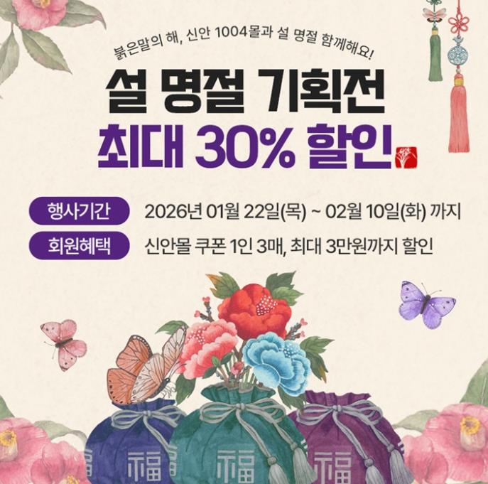 [무한뉴스=정민정 기자] 신안군은 다가오는 설 명절을 맞아 지역 농어가와 소상공인 판로 확대를 위해 온라인 쇼핑몰 ‘신안1004몰)’에서 1월 22일부터 2월 10일까지 설 명절 특별 기획전을 진행한다.