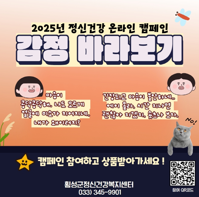 참여는 횡성군정신건강복지센터 인스타그램 또는 포스터 내 QR코드를 통해 가능하며, 추첨을 통해 100명에게 소정의 기념품이 제공된다.