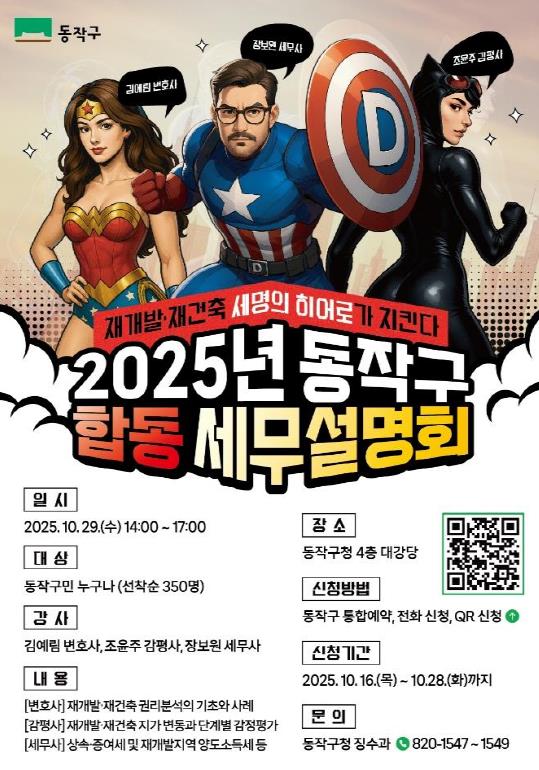 [무한뉴스=정승훈 기자] 동작구가 오는 10월 29일 오후 2시, 구청 신청사 4층 대강당에서 재개발 및 재건축 분야를 주제로 ‘2025년 합동 세무 설명회’를 개최한다고 밝혔다.