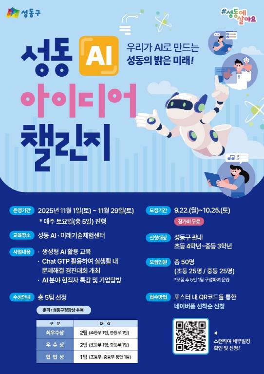 정원오 성동구청장은 “이번 챌린지를 통해 아이들이 AI를 활용해 우리 사회에 기여하는 방법을 배우고, 미래 인재로 성장하는 계기가 되기를 바란다”며, “앞으로도 변화하는 미래 사회에 대비할 수 있는 다양한 기회를 만들어 나가겠다”고 말했다.